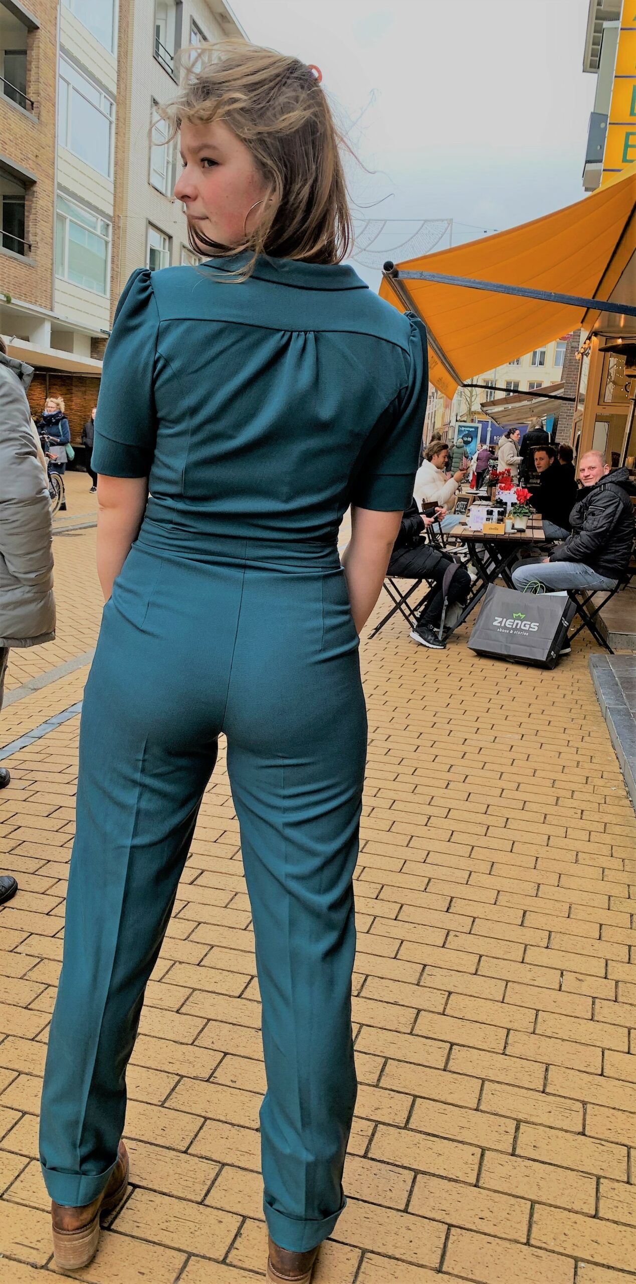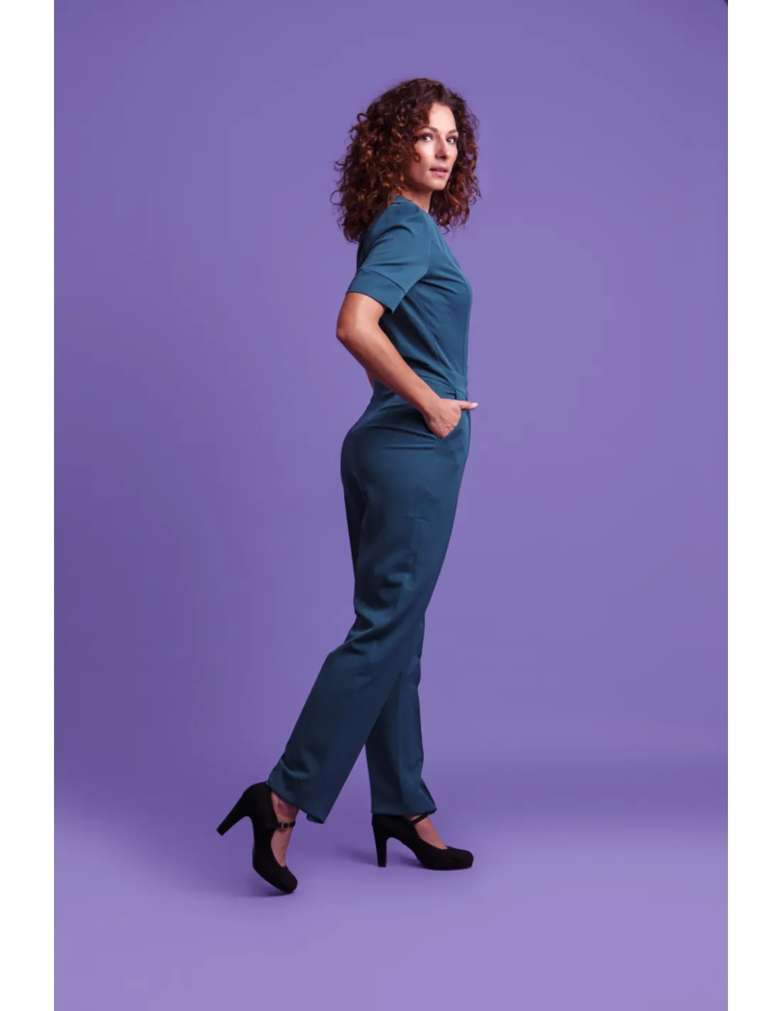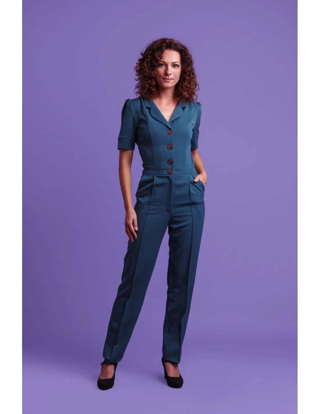 Dit broekpak heeft een knoop- en ritssluiting voor en de iets toelopende broekspijpen hebben een gestikte vouw aan de voorzijde. Draag het pak met pumps, sneakers of laarsjes en je zult zien hoe veelzijdig dit broekpak is!