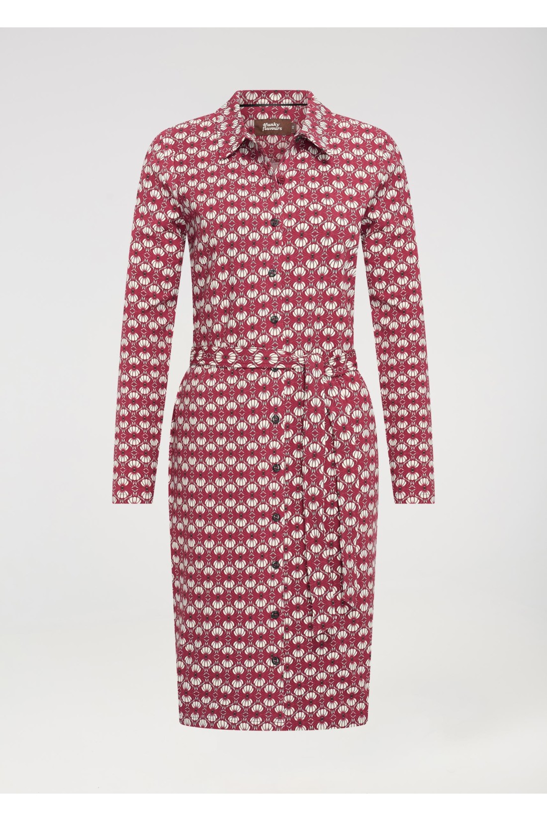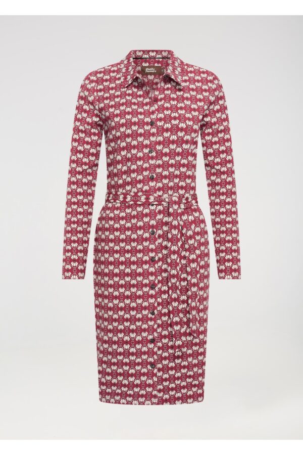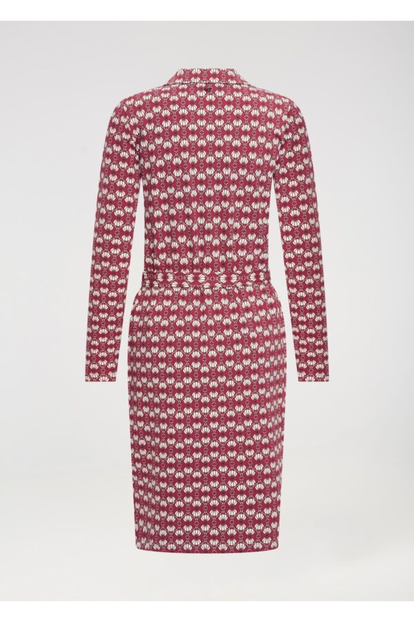 Katoenen jersey blousejurk met elastaan. Grafische print, knoopsluiting die deels dichtgestikt is, kraag, ceintuur en lange mouw. Kleur: Donkerbruin / Donkerrood / Crème