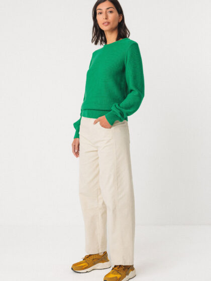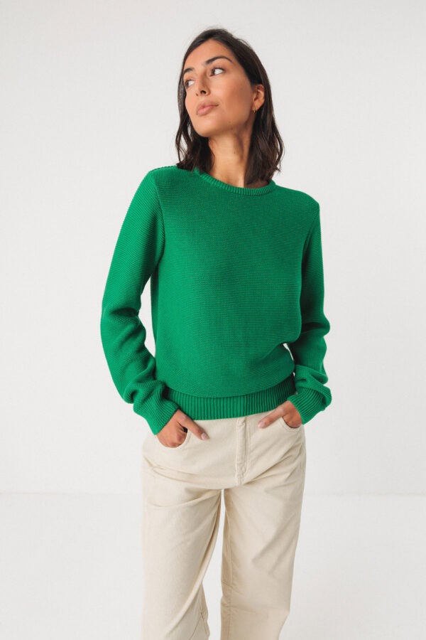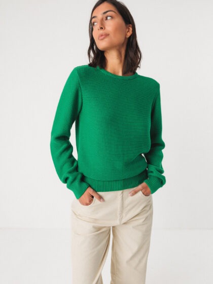 GOTS gecertificeerde biologisch katoenen gebreide trui met een ronde hals, lange mouwen en geribbelde bies bij de kraag, zoom en manchetten.