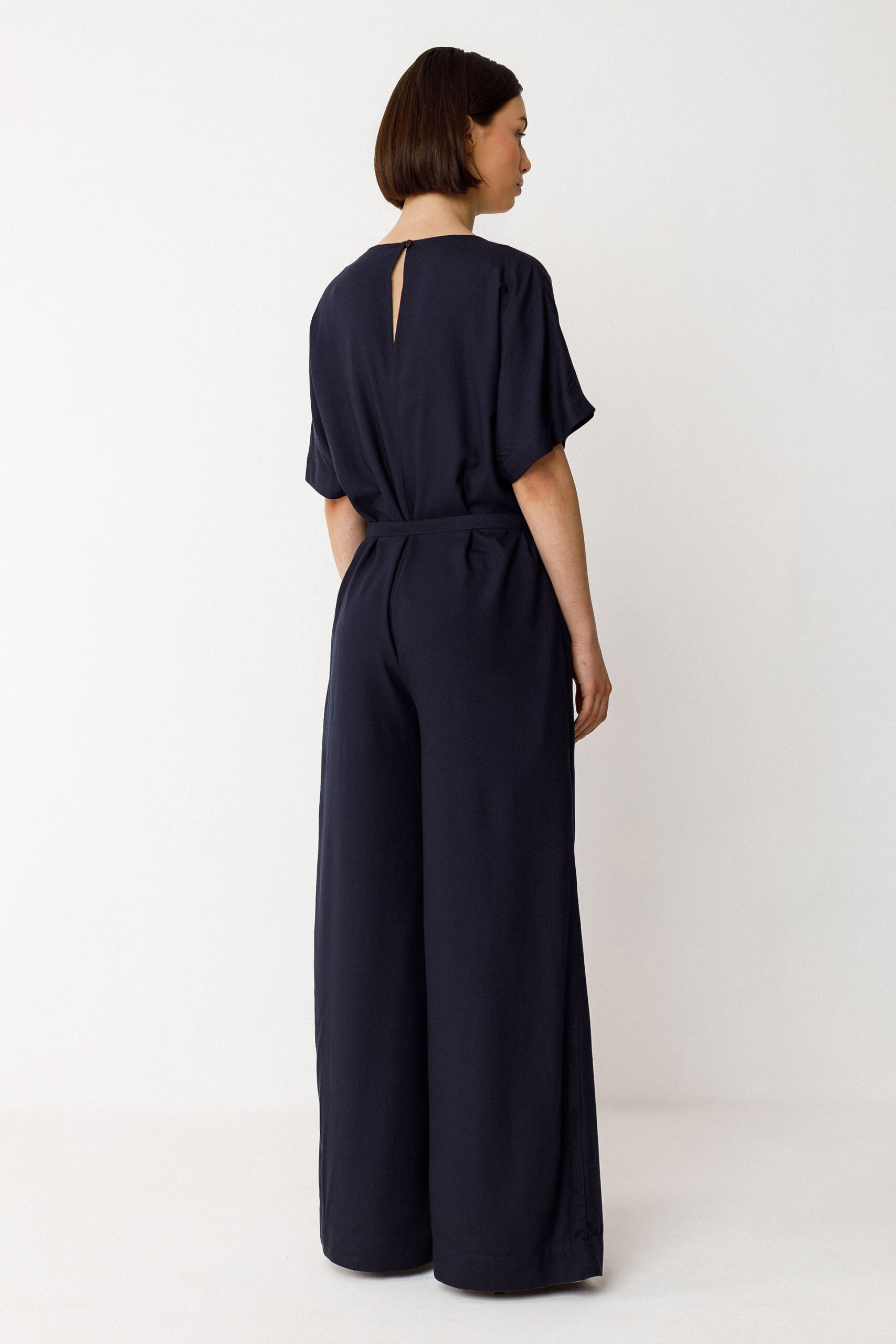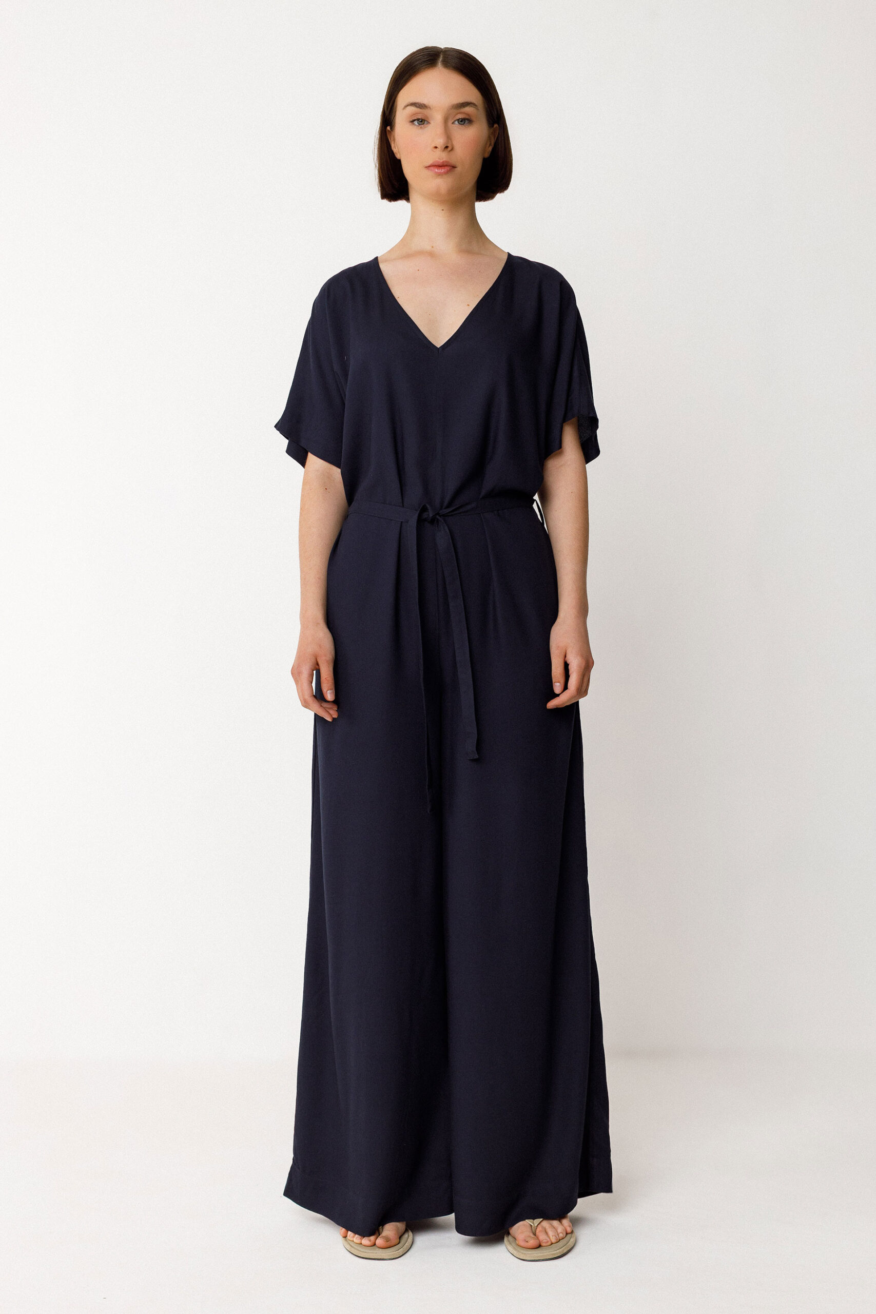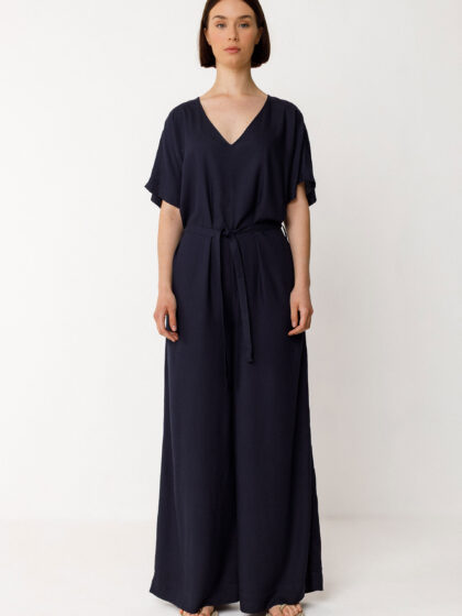 Lange, loszittende jumpsuit met korte dolmanmouwen en een diepe V-hals. Achterste knopsluiting met decoratieve uitknipping. Met zakken bij de zijnaden.