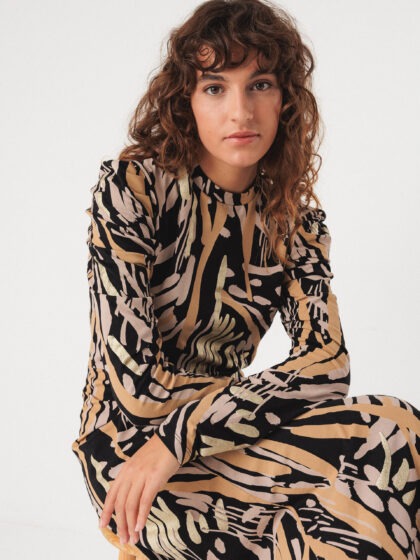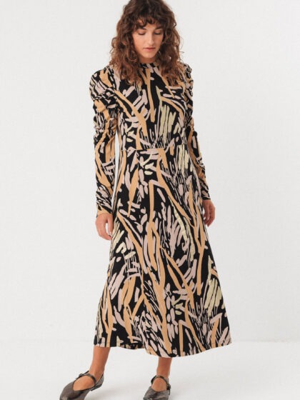 Middellange jurk van elastisch biologisch katoen. Het heeft lange mouwen met rimpels bij de schouders en een uitlopende rok.