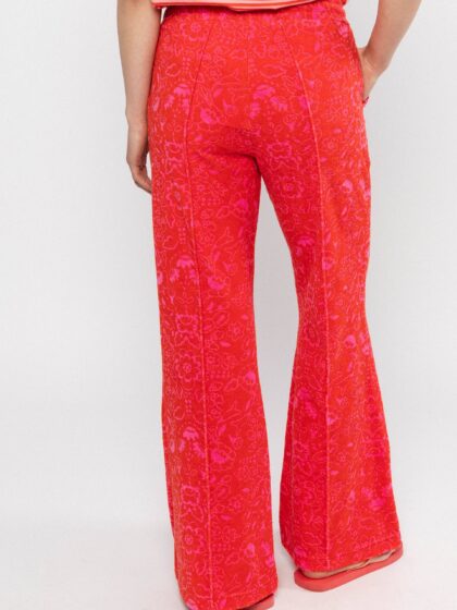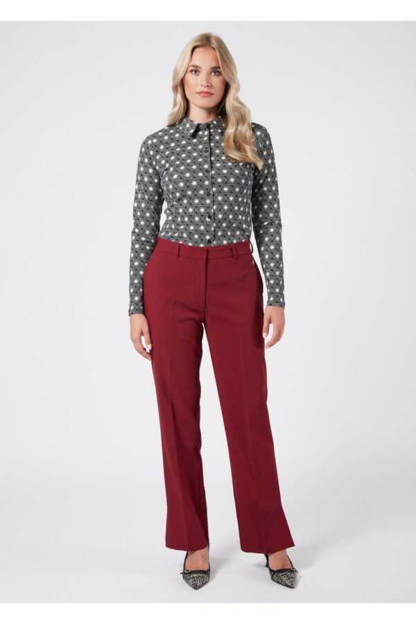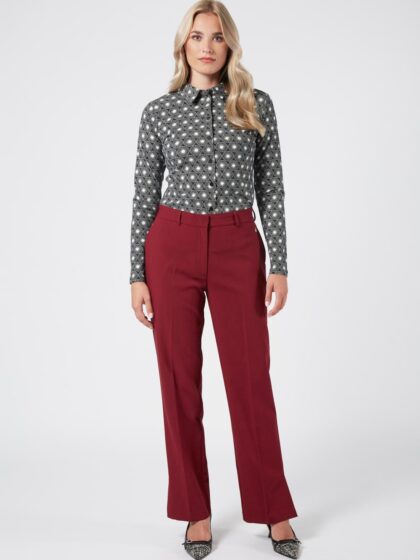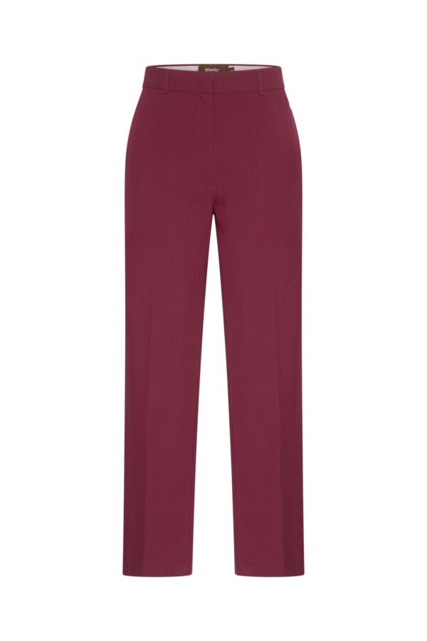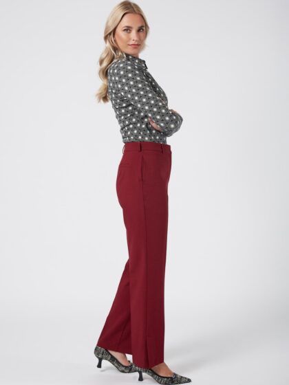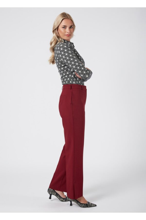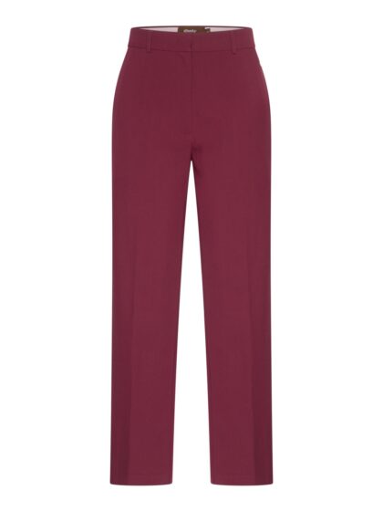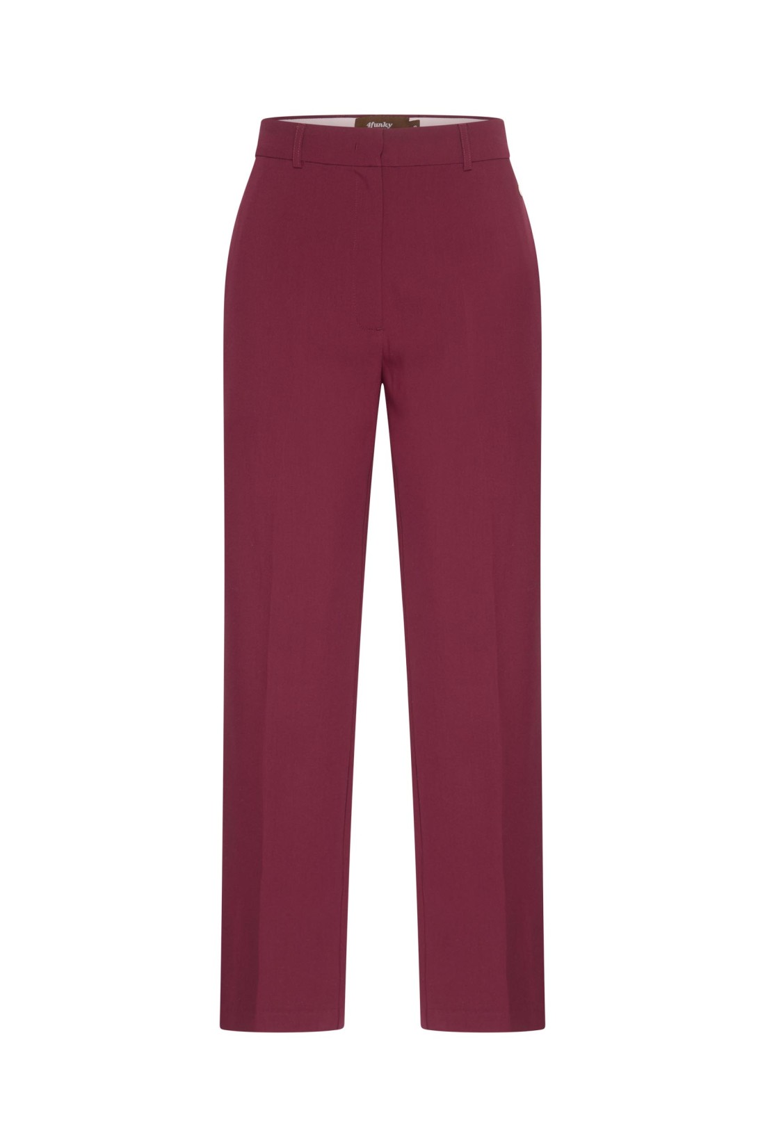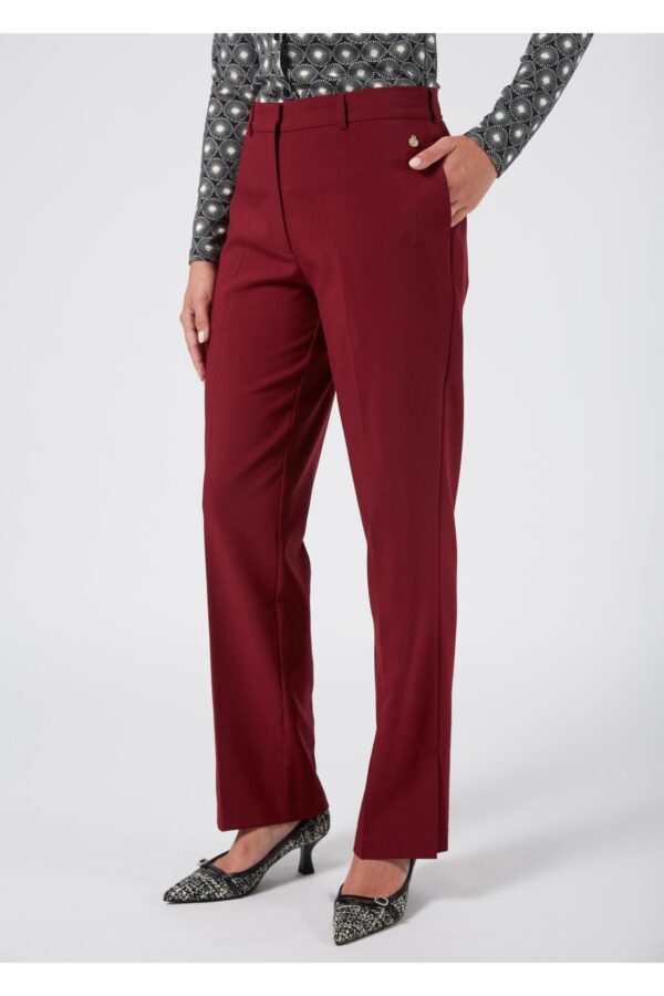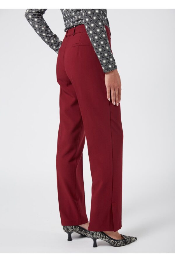 Rode pantalon met rechte pijpen, zijnaad zakken, zijsplitten, ingestreken vouw en strookzakken op de achterkant.